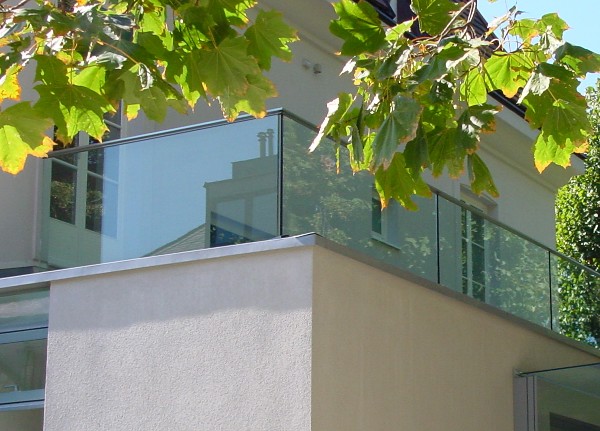 Glasbrüstungsgeländer mit Edelstahlhandlauf in Nurglasausführung